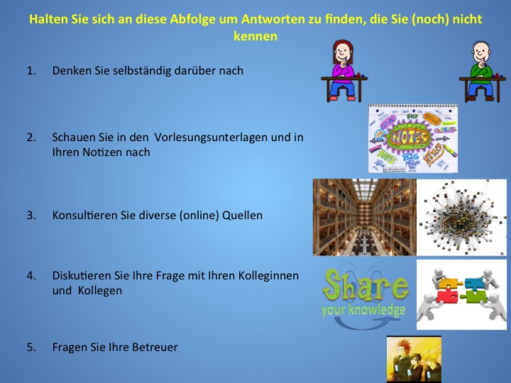 | Ablauf | Regeln | Finden von Antworten | Das Übungsprojekt | Organisation der Übungen |