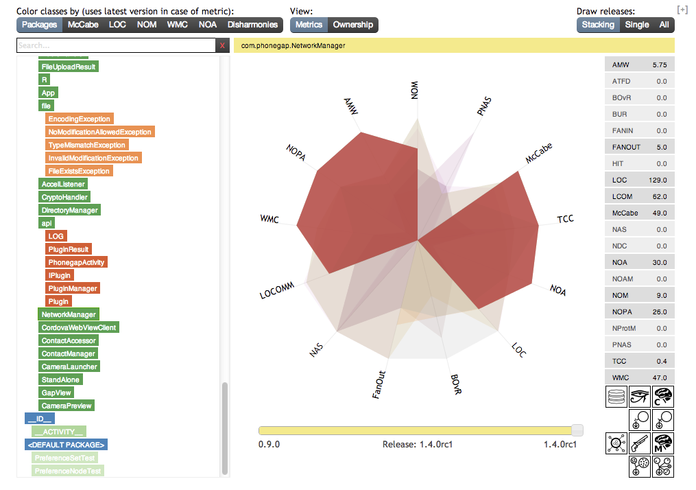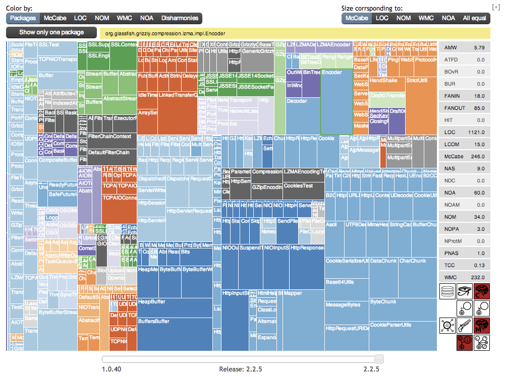 - Project Treemap. It gives an overall view of the project structure and hierarchy and the metrics associated to its entities, its classes and packages, using an interactive treemap. The color and size of the rectangles representing the classes can be bound to different metrics (LOC, NOM, WMC, NOA, Code Disharmonies, etc.). When hovering over a specific entity in the map, the side panel will show the values of several related metrics. A slider allows the user to "go back in time" and examine the treemap of any past major version of the system.