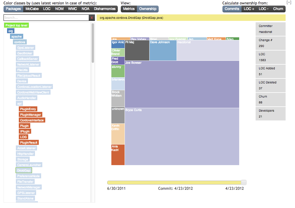 This view shows the distribution of ownership of a selected entity between the projects's developers. The size of each rectangle in the treemap respresents the code ownership for a specific committer, i.e., committers associated with a larger rectangle have a stronger ownership than those with a small one. Ownership information is calculated using four different techniques: code churn, lines of code added, lines of code deleted and number of commits. The user can select the one that the visualization should use.-