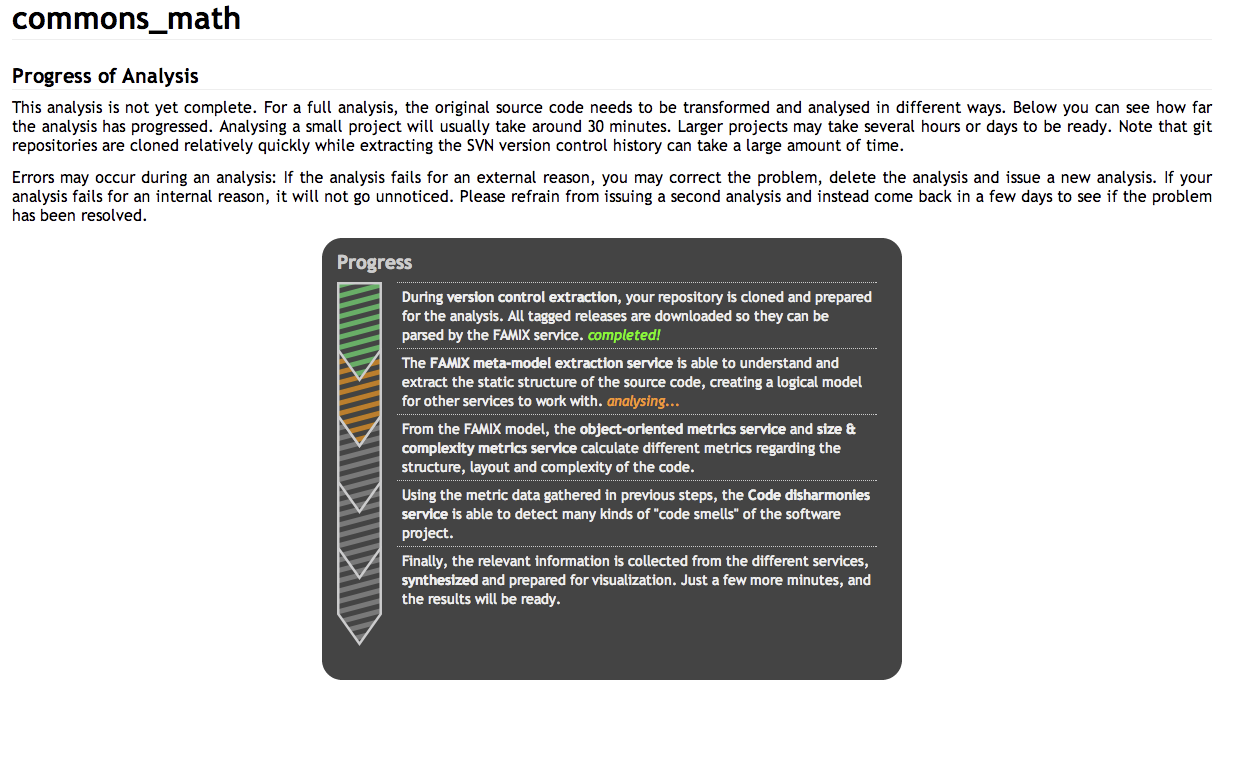 When visiting the main web page of the Facets front-end, the visitor is presented with the simple submission form shown underneath. The user needs to enter only the URL of the project repository, select if it’s a git or SVN repository, and give a name for the analysis request. The analysis request is submitted by the click of a button. The back-end first does some automatic sanity checks on the repository and if successful, the user is supplied with two URLs. Both lead to the new analysis page, however one of the links contains an additional argument that contains a token. Using the link with the token will allow the visitor to delete the analysis. With this simple method, only the creator of an analysis can delete it, without the need for a user registration form or a user database.