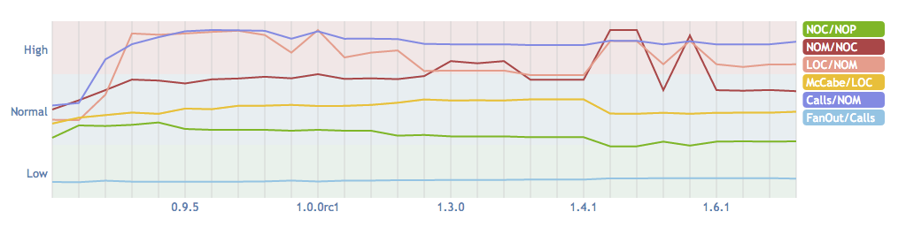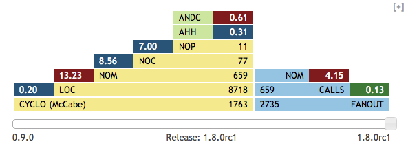 - Overview Pyramid. It gives a concise view over the complexity, coupling and hierarchy of every major version of the system (users can scroll through the different version using a slider). This pyramid, based on the Metrics Pyramid introduce by Lanza and Marinescu in Object-Oriented Metrics in Practice, consists of three parts targeting different project properties: