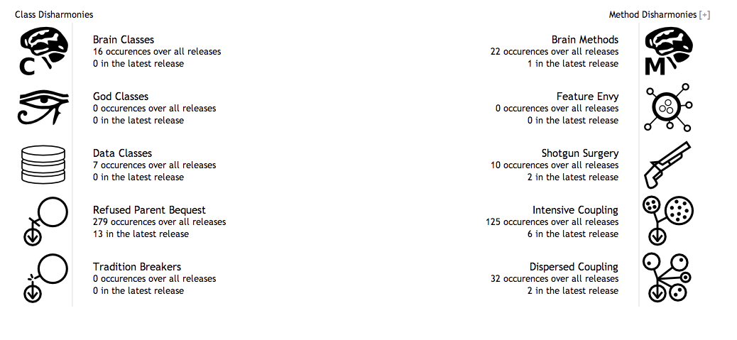 - Code Disharmonies List. It displays a summary of all the code disharmonies found for every major version of the system.