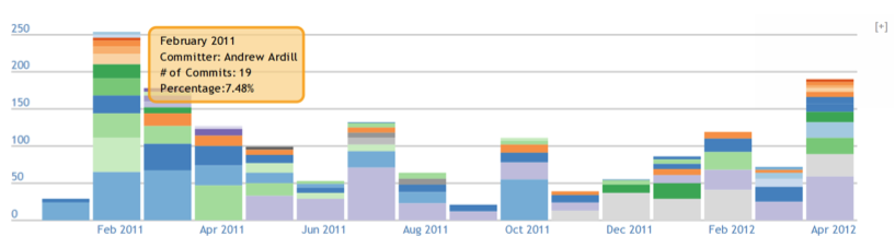 - Commits per Month This view plots on a graph the number of commits by every committer for every month in the project's history. Hovering over the column sections reveals information on the respective committer as shown in the screenshot below.