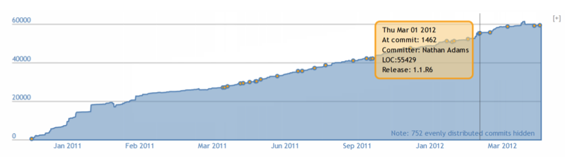 - Lines of Code. In this view the commits are plotted on the X axis while the Y axis represents the number of lines of code. As such, the X axis does not represent linear time. However, timestamps are provided at regular intervals to ease orientation. Hovering over the plot will show the commit information at any point on the graph, such as the date, the name of the committer, how many lines of code the project has at this point, and if the commit represented the release of a new version of the system, the name of the release will be shown as well (along with a small colored circle).