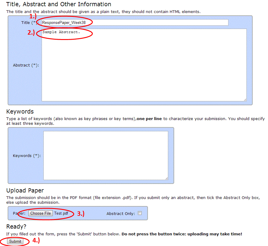 Enter the title of your project report (see 1.), enter an abstract if you have one, else enter "Sample Abstract." (see 2.). Then upload your response paper (see 3.) and submit (see 4.).